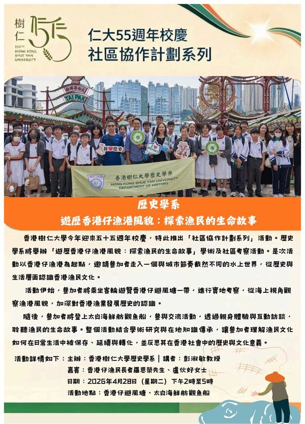This year marks the 55th anniversary of Hong Kong Shue Yan University. To celebrate this milestone, the University is launching the “Community Service Project Series.” The Department of History will organize an academic and community field study activity entitled “Exploring the Aberdeen Fishing Harbour: Discovering the Life Stories of Fisherfolk.”