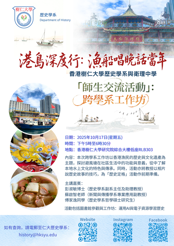 本次跨學系工作坊以香港漁民的歷史與文化遺產為主題,探討避風塘在社區生活中的功能與意義,從中了解本地水上文化的特色與傳承。同時,活動亦將教授以相片說歷史故事的技巧,為「歷史定格」活動作前期準備。